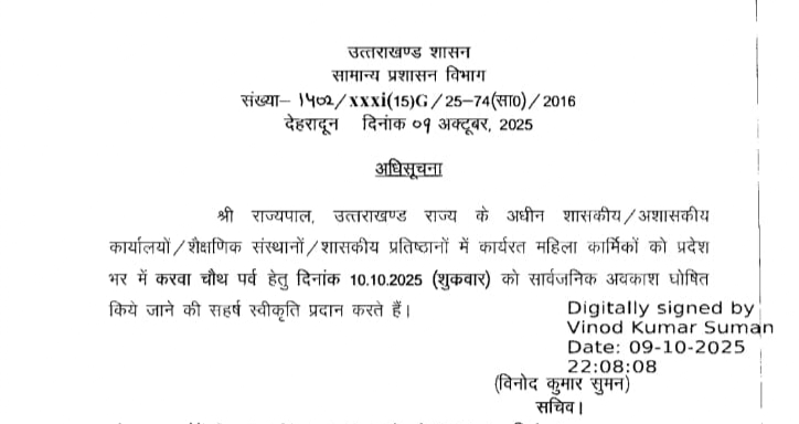 देहरादून: उत्तराखंड सरकार ने करवाचौथ के अवसर पर शुक्रवार को महिला कर्मचारियों के लिए विशेष सौगात दी है। सचिव विनोद कुमार सुमन के आदेशानुसार, इस दिन प्रदेश के सभी शासकीय, अशासकीय कार्यालयों, शिक्षण संस्थानों और सरकारी प्रतिष्ठानों में महिला कर्मियों के लिए सार्वजनिक अवकाश घोषित किया गया है। यह कदम महिलाओं को पर्व मनाने की सुविधा प्रदान करेगा।